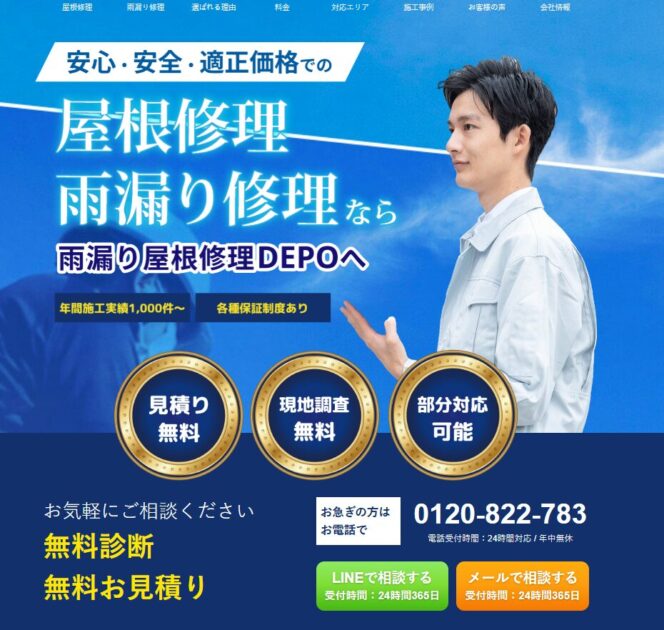 | サービス | 雨漏り修理の相談、修理工事(部分修理可)、屋根診断、火災保険による0円修理 |