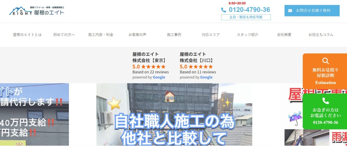 | サービス | 雨漏り修理の相談、修理工事(部分修理可)、屋根診断、火災保険による0円修理 |