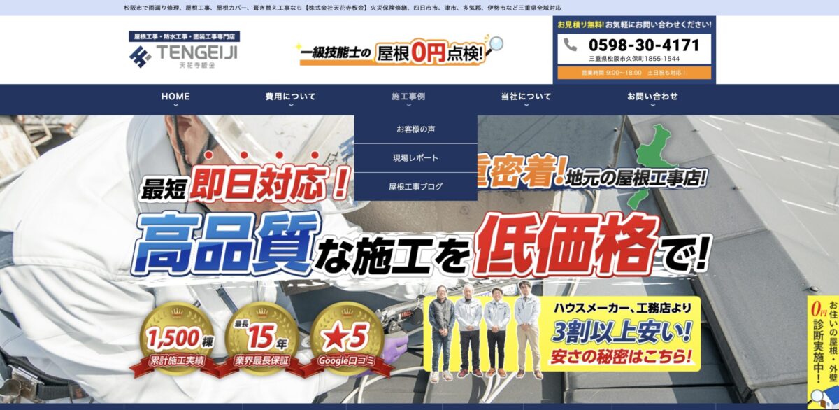 | サービス | 雨漏り修理の相談、修理工事(部分修理可)、屋根診断、火災保険による0円修理 |