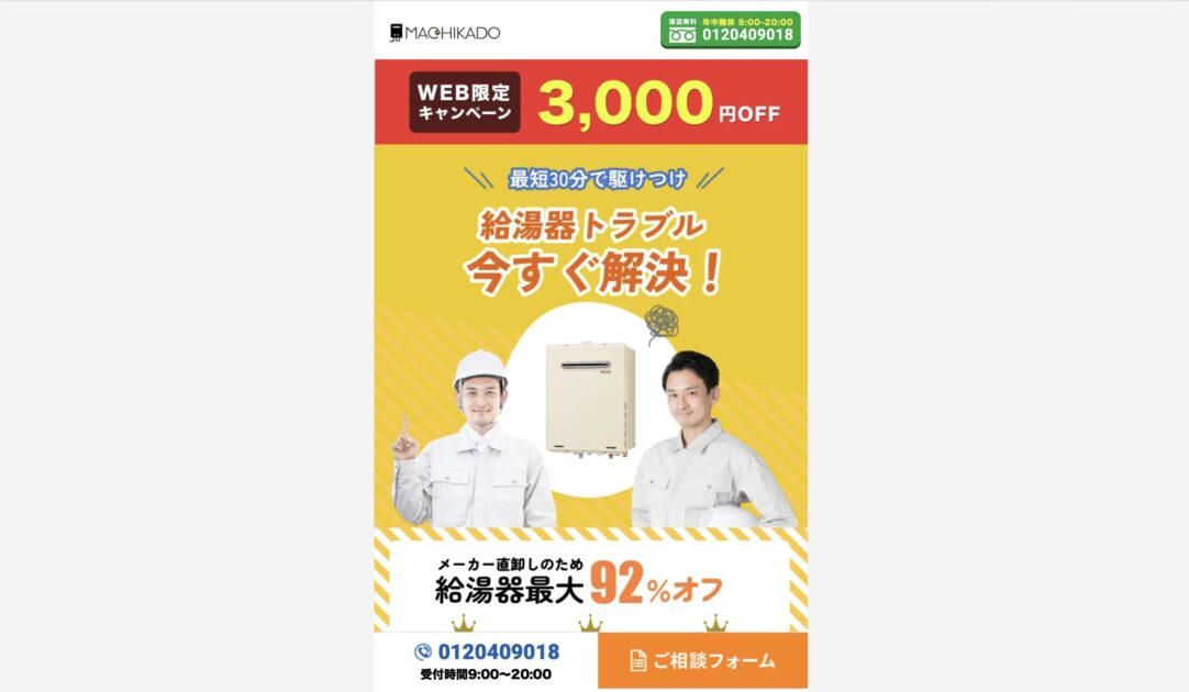 街角給湯相談所は、年中無休で夜9時まで受け付けしている給湯器交換業者です。