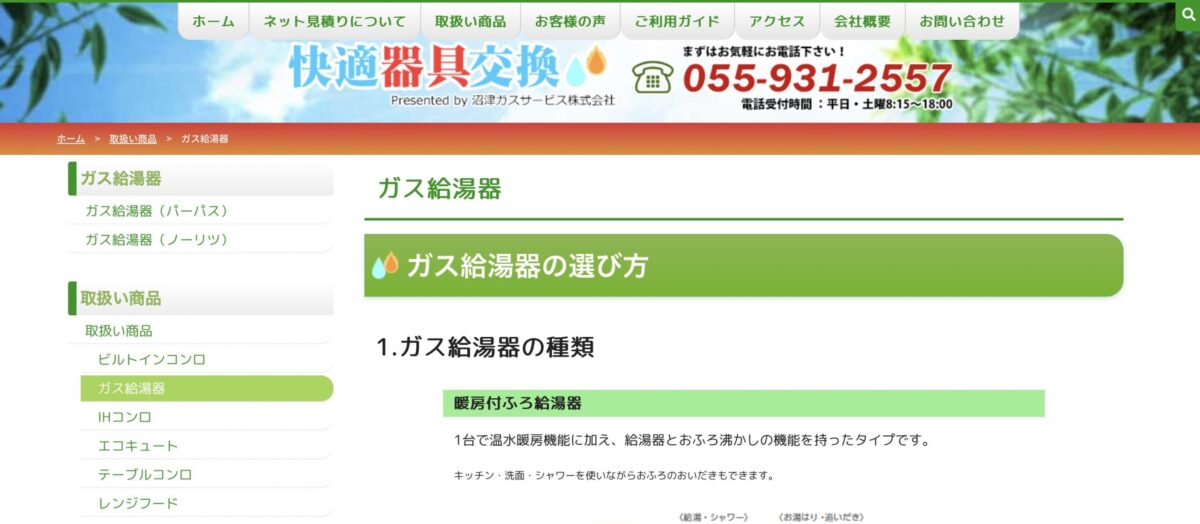 | サービス | 給湯器の点検、修理、交換、アフターサービス |