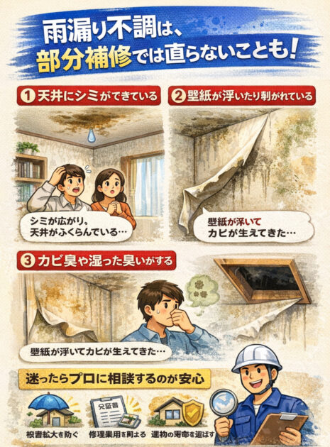 天井から水が落ちたり、室内が湿気でカビやすくなるなど、日常生活に支障が出ることがあります。