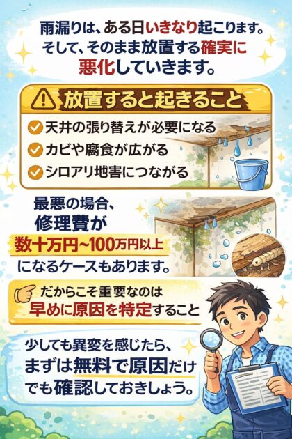 雨漏りを放置すると、建物内部の腐食やシロアリ被害につながる可能性があります。
